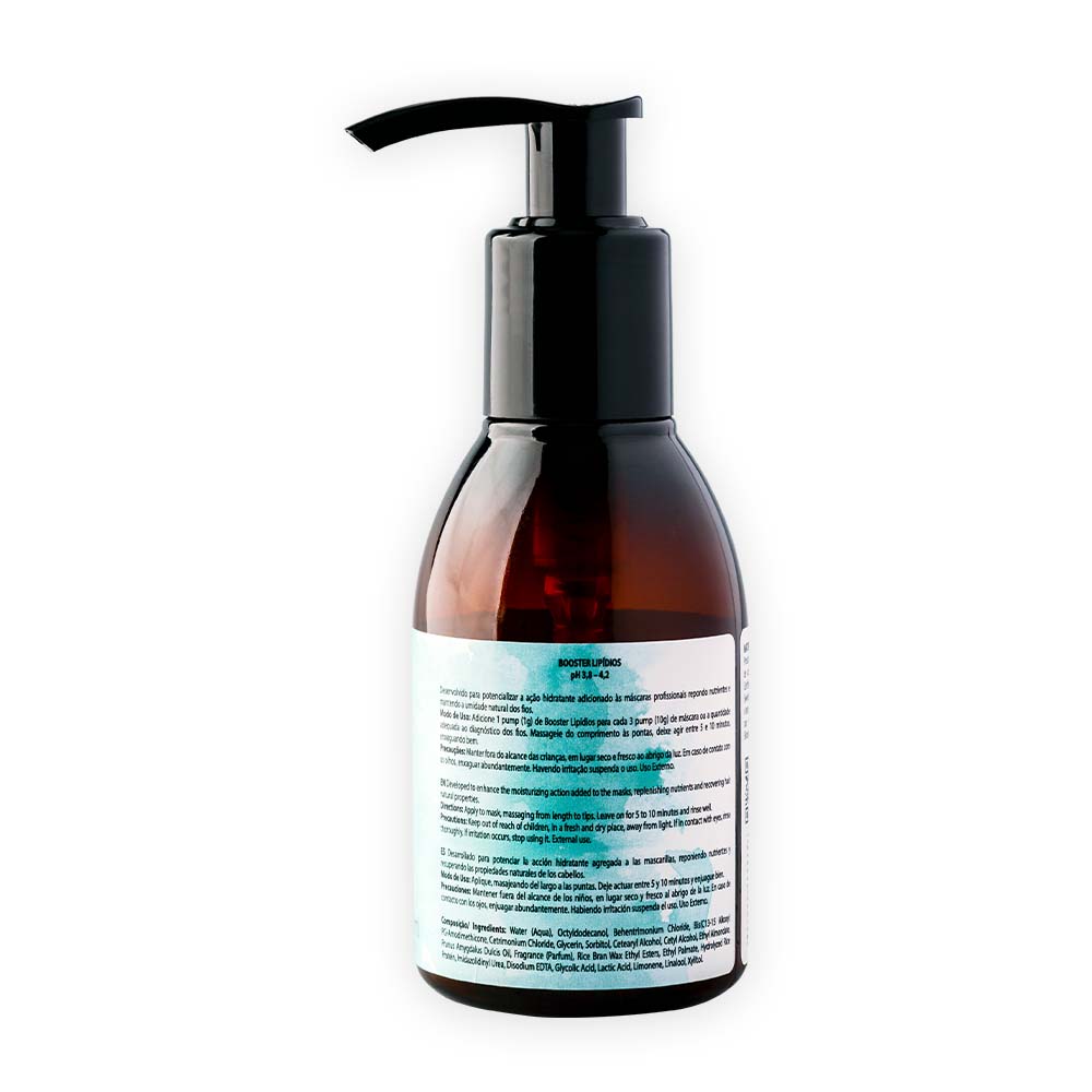 Adicione 1 pump (1g) de Booster Lipídios para cada 3 pump (10g) de máscara ou a quantidade adequada ao diagnóstico dos fios. Massageie do comprimento às pontas, deixe agir entre 5 e 10 minutos, enxaguando bem.