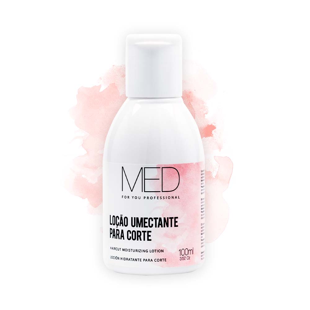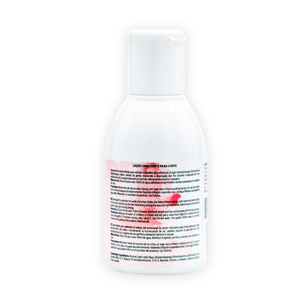 Diluir 5ml de Loção Umectante Para Corte para cada 100 ml de água, colocar em um borrifador agitar e aplicar nos fios. Desembaraçar e proceder com o trabalho de corte.